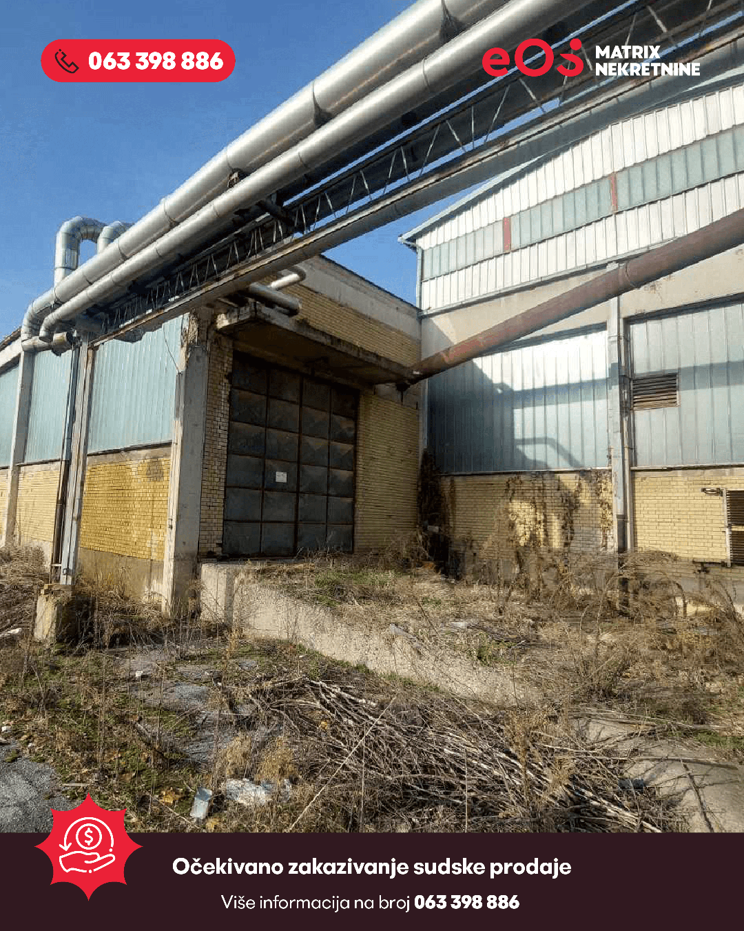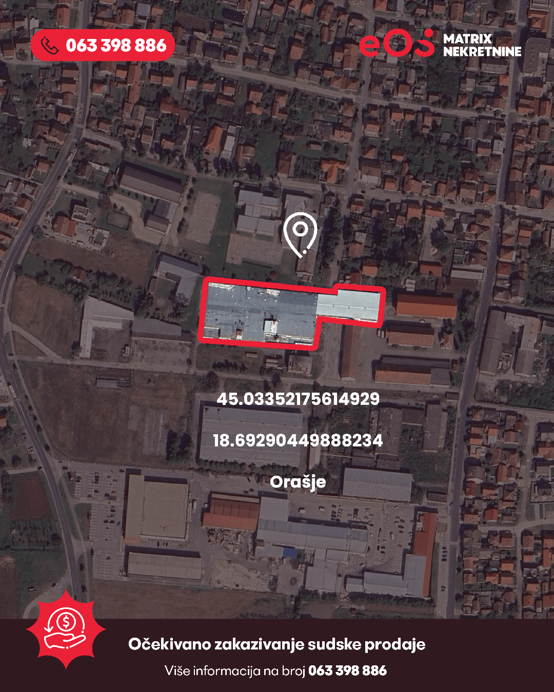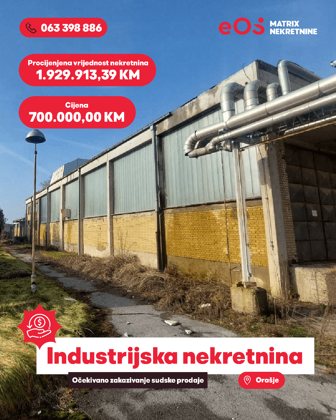 Pozivamo sve zainteresirane fizičke i pravne odobe da iskažu interes za kupovinu industrijskog kompleksa smještenog u centralnoj zoni Orašja. Prodaja nekretnine izvršit će se u okviru sudskog postupka koji se vodi pred Općinskim sudom u Orašju.