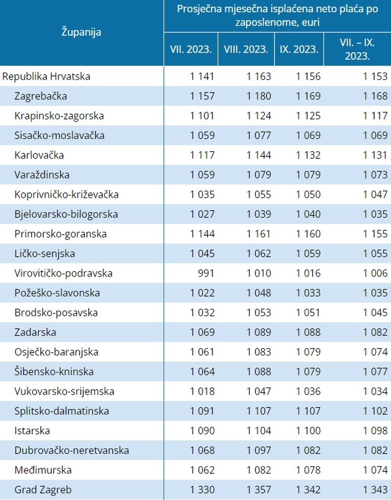 Najviša prosječna mjesečna isplaćena neto plaća po zaposlenome u pravnim osobama u trećem tromjesečju 2023. isplaćena je u Gradu Zagrebu i iznosi 1343 eura, slijede Zagrebačka županija s 1168 eura, Primorsko-goranska s 1155 eura, Karlovačka s 1131 eurom, Krapinsko-zagorska s 1117 eura i Splitsko-dalmatinska županija s 1102 eura.