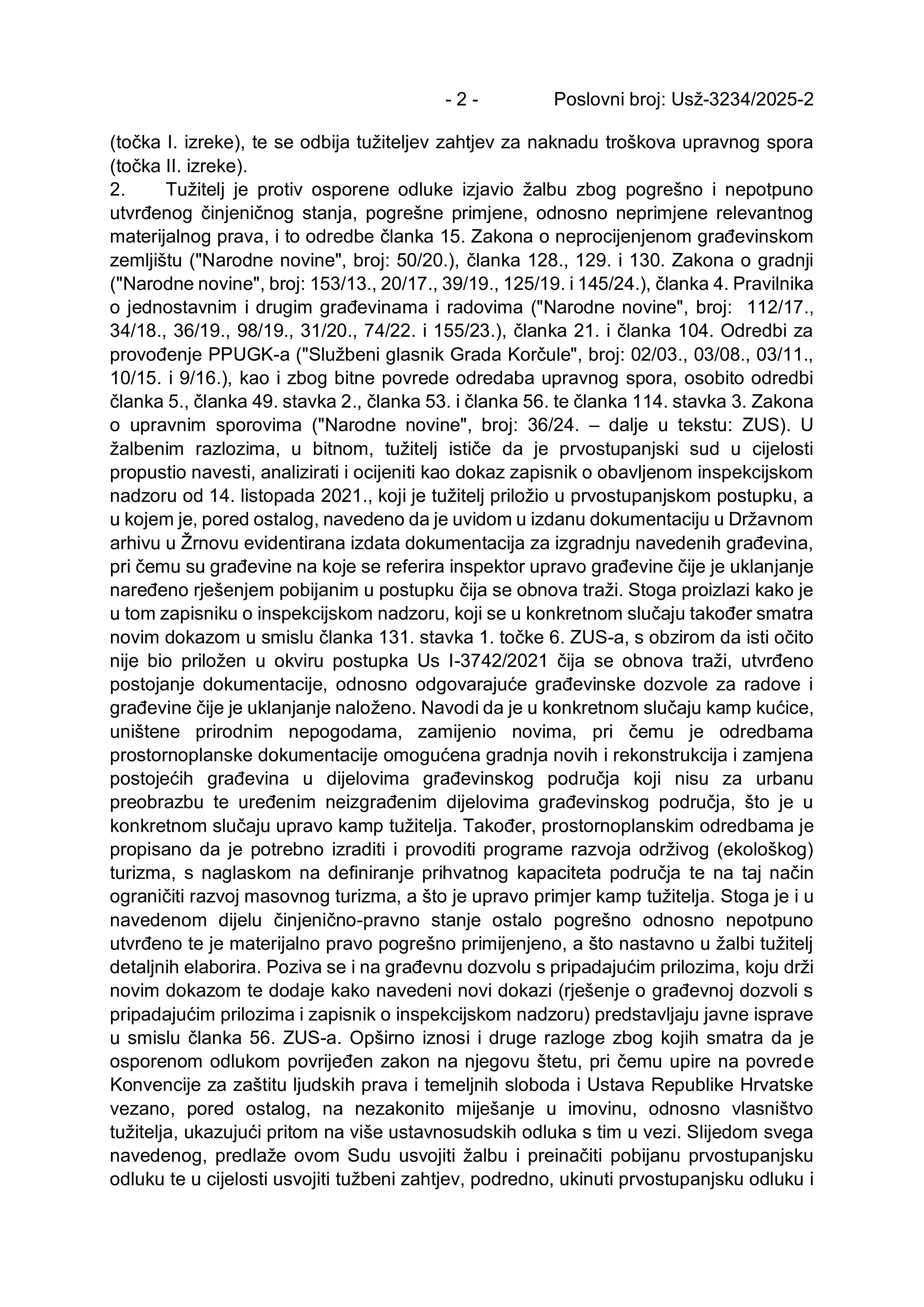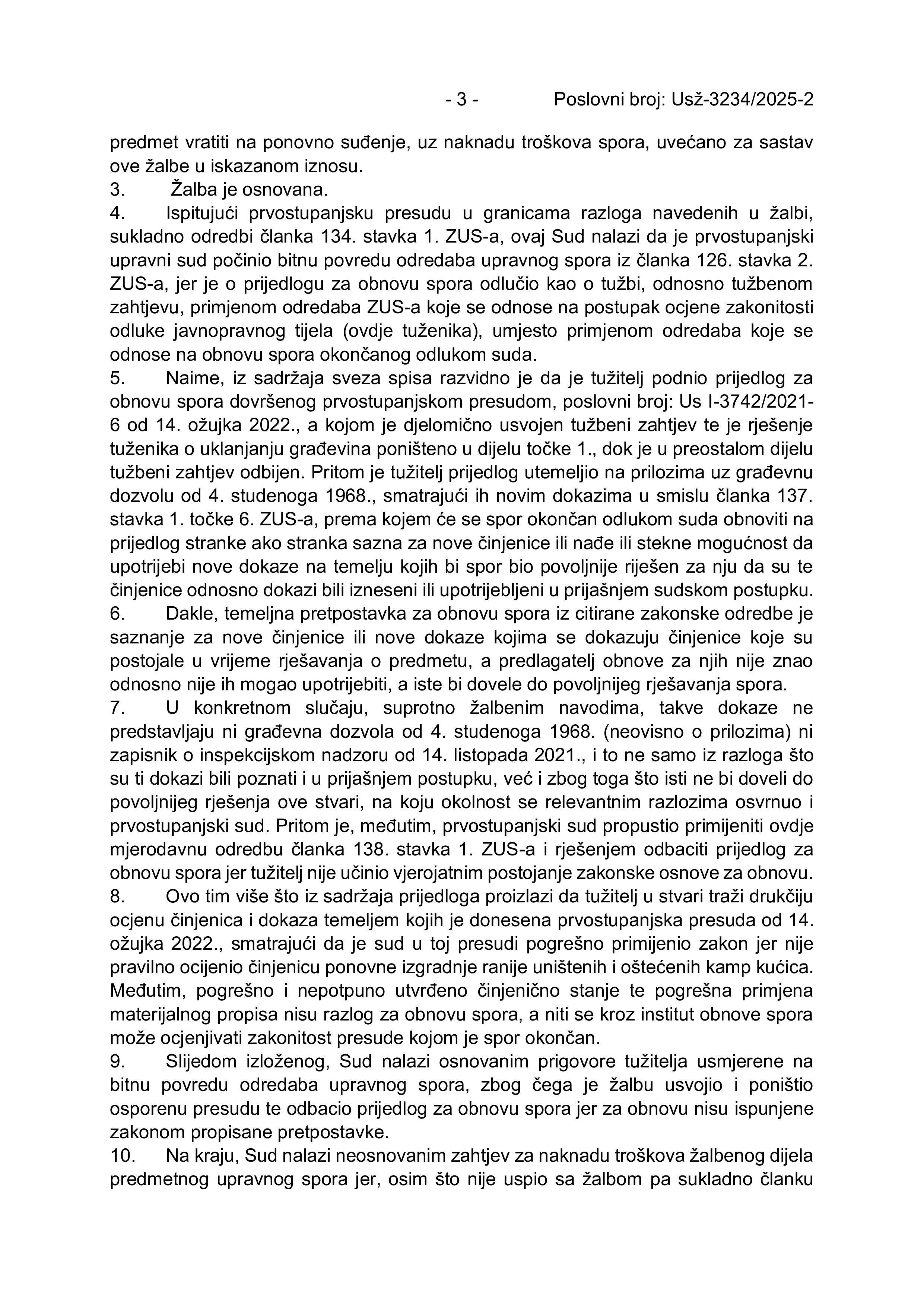 Sud je detaljno obrazložio da Grad nije uspio dokazati postojanje tzv. “novih dokaza” koji bi opravdali obnovu upravnog spora. Pozivanje na arhivsku građevinsku dokumentaciju iz 1968. godine i zapisnik inspekcijskog nadzora iz 2021. ocijenjeno je pravno neutemeljenim, jer su ti dokumenti bili poznati i ranije te ni u kojem slučaju ne bi mijenjali ishod postupka. Presuda odbacuje zahtjev Grada kao neosnovan i time stavlja točku na višegodišnji pravni proces u kojem Grad ostaje bez mogućnosti daljnjeg manevriranja.