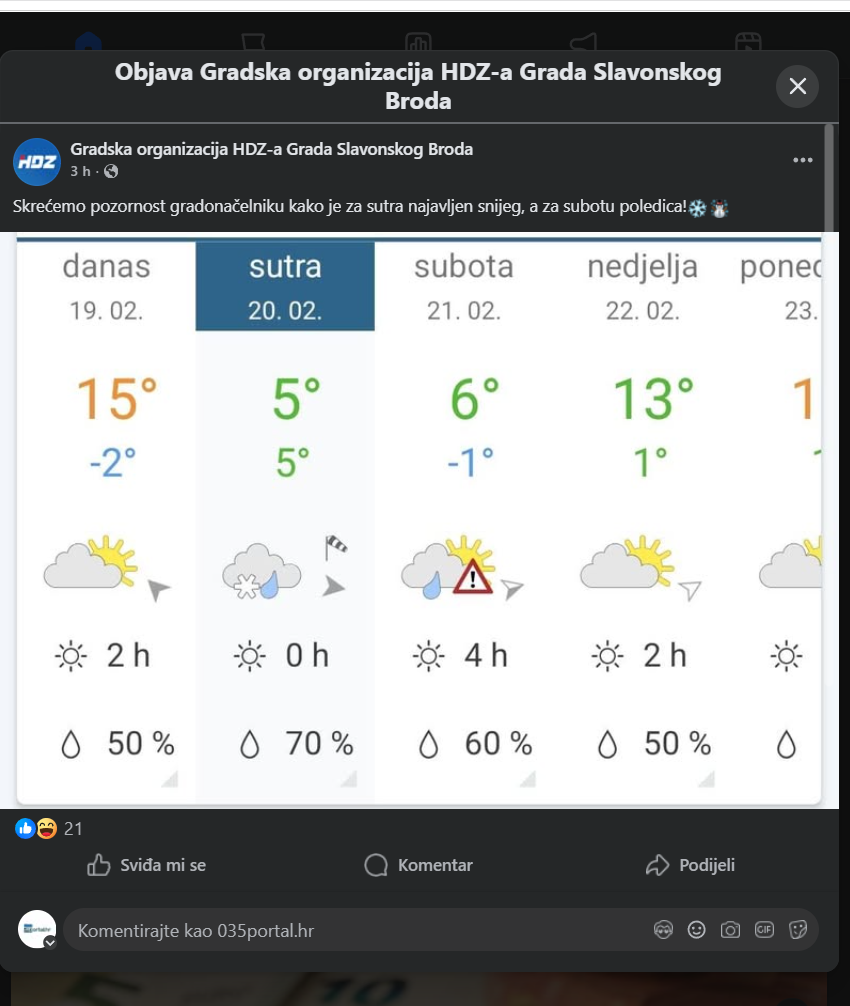 Status koji je večeras nasmijao mnoge Brođane, a ujedno podsjetio da je gradska oporba živa, stigao je s Facebook stranice Gradske organizacije HDZ-a Slavonski Brod.
