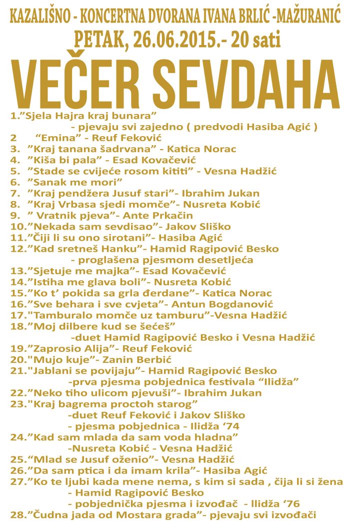 Zvijezde sevdaha će pratiti orkestar Damira Galijaševića kojemu će se na harmonici pridružiti i naš Brođanin Nedo Dukić, a zapjevat će nakon dugo vremena i legendarni brodski pjevač Jakov Sliško, Katica Norac, te organizator i domaćin cijelog ovog spektakla Ante Prkačin, koji je o samom koncertu rekao – To po ničemu neće biti tipični koncert. Svi će izvođači sjediti na pozornici, divaniti o sevdahu i svatko će po nešto otpjevati. Posebno mi je drago da možemo Brođanima priuštiti ovakav glazbeni spektakl, te da možemo predstaviti nakon dugo vremena našeg Jakova, Katicu i Nedu Dukića. Tu će sjediti i Franjo Knežević, pa se ja nadam da ni on neće odoljeti cijeloj atmosferi i da će malo zapjevati.-