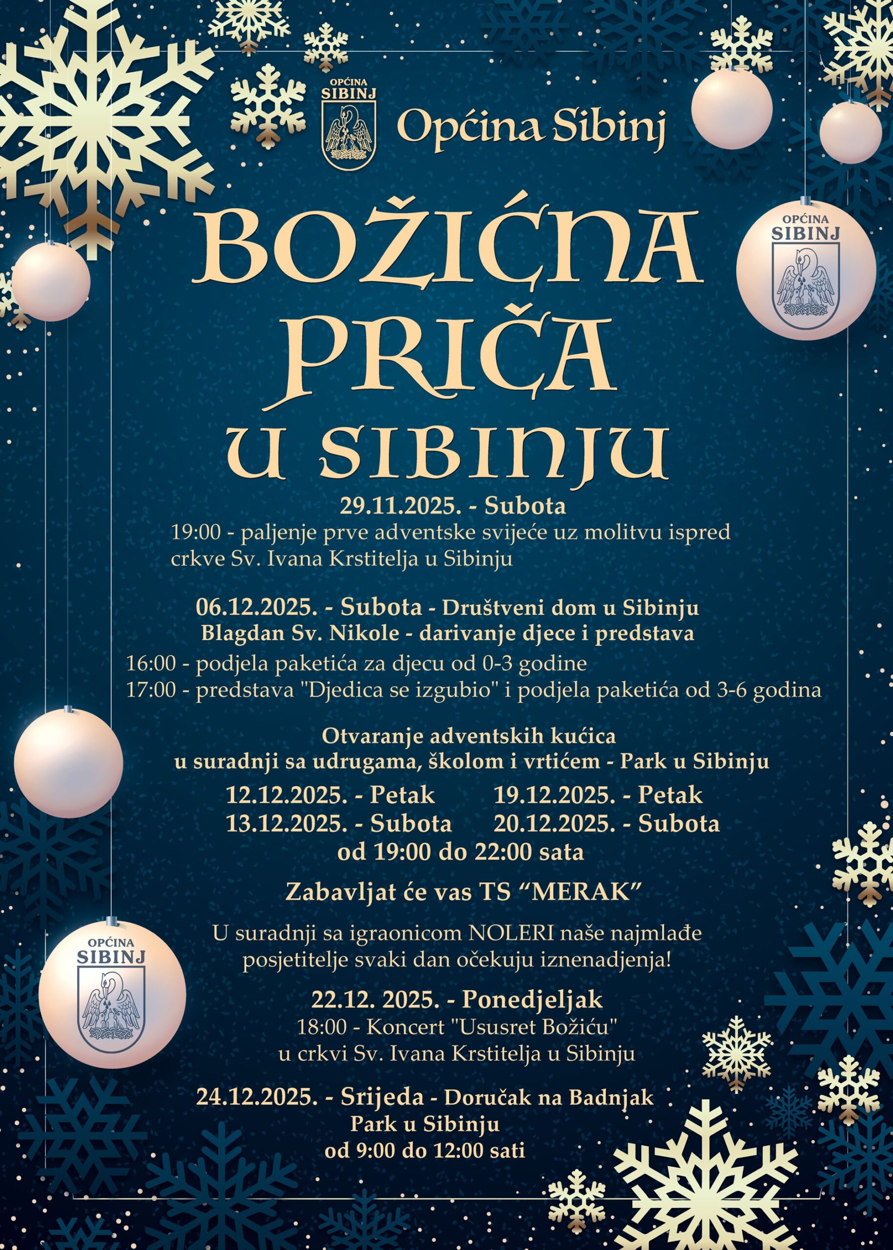 Blagdan sv. Nikole, 6. prosinca, u Sibinju će biti posvećen najmlađima. Društveni dom pretvara se u veliku pozornicu ispunjenu dječjim smijehom – od 16 sati dijelit će se paketići mališanima do tri godine, a već u 17 sati slijedi predstava „Djedica se izgubio“ i nova runda darivanja za djecu od tri do šest godina. Čarolija koja se pamti.