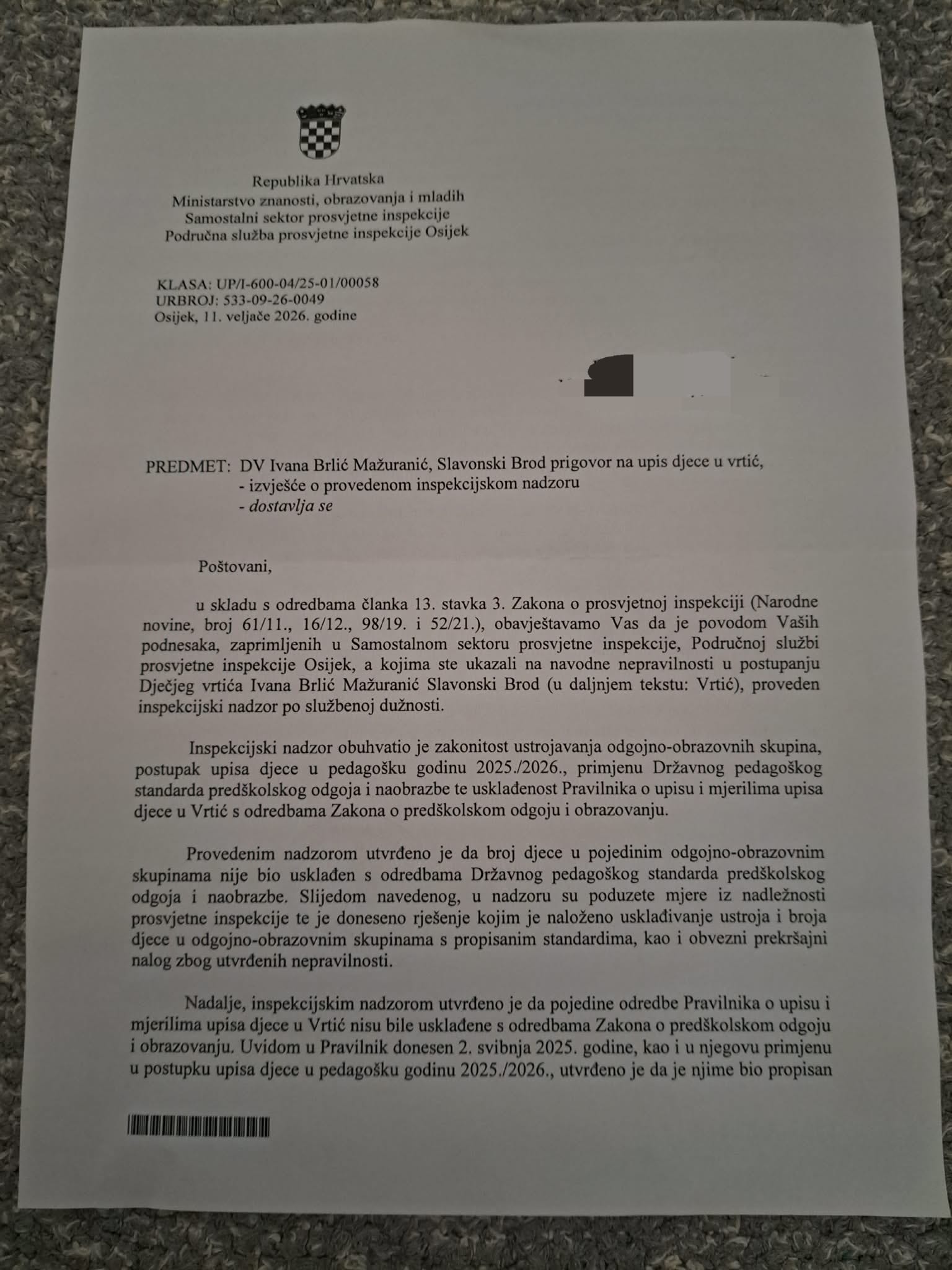 Prosvjetna inspekcija Ministarstva znanosti, obrazovanja i mladih provela je nadzor u Dječjem vrtiću „Ivana Brlić Mažuranić“ u Slavonskom Brodu, povodom prigovora na upise u pedagošku godinu 2025./2026. Nalaz pokazuje da su utvrđena konkretna odstupanja – i u organizaciji skupina i u samim pravilima upisa.