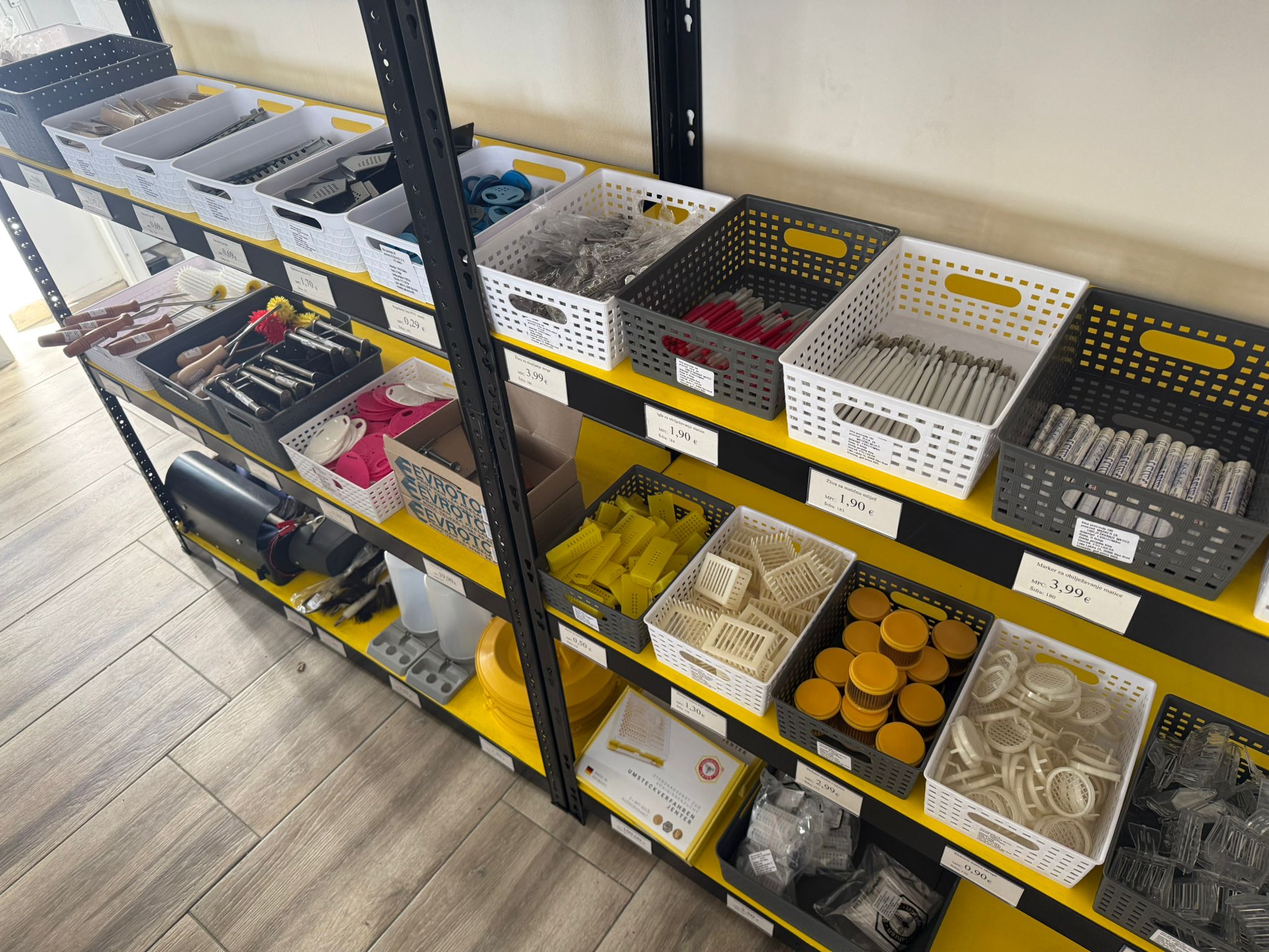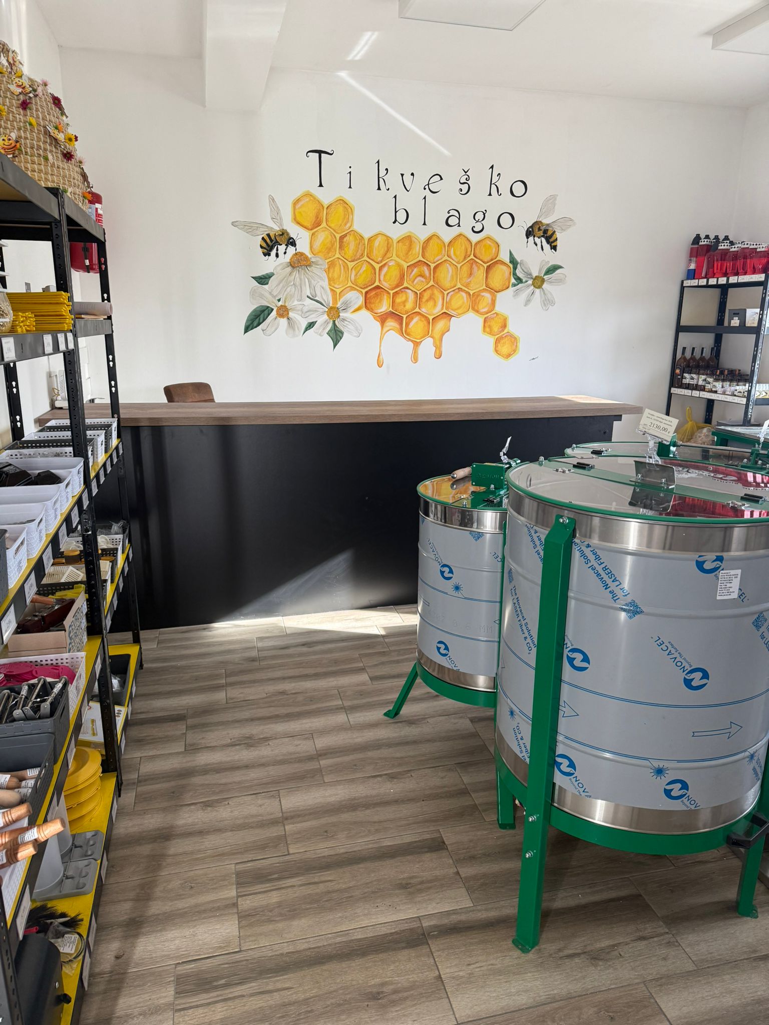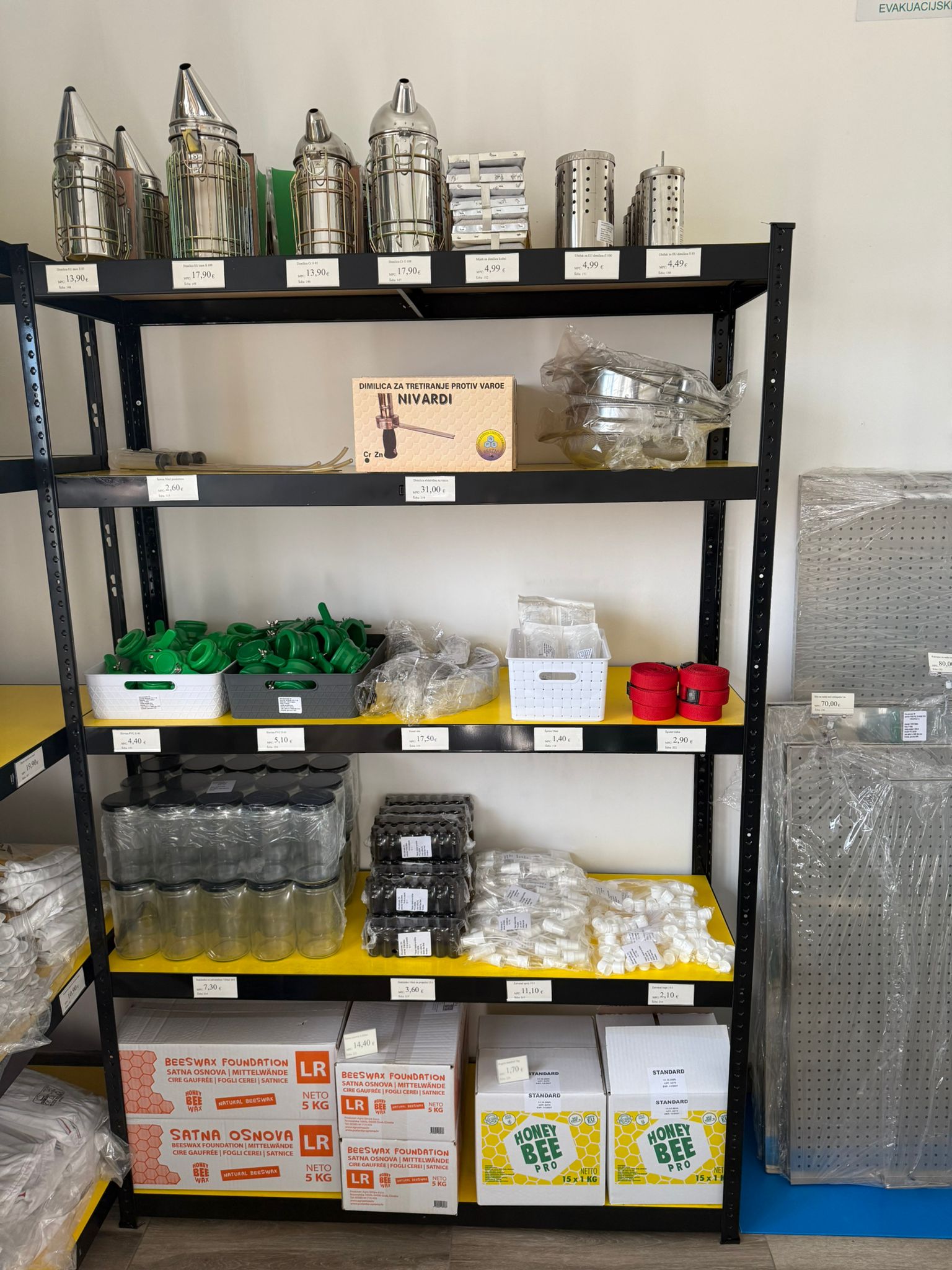 Trgovina „Tikveško blago“ u Slavonskom Brodu specijalizirana je upravo za pčelarsku opremu i pokriva sve faze pčelarenja – od postavljanja i opremanja košnica, rada na pčelinjaku, do vrcanja, prerade i pakiranja meda.